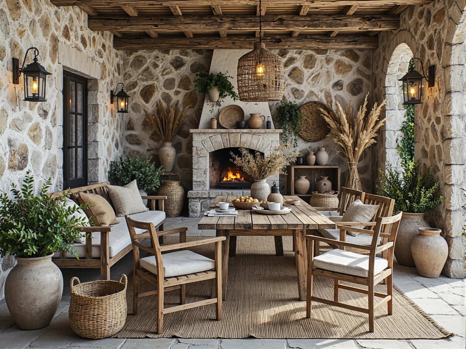 • Tekstylia: Poduszki, koce z frędzlami, plecione dywany zewnętrzne i makramy. To one odpowiadają za komfort i wizualne ciepło.
